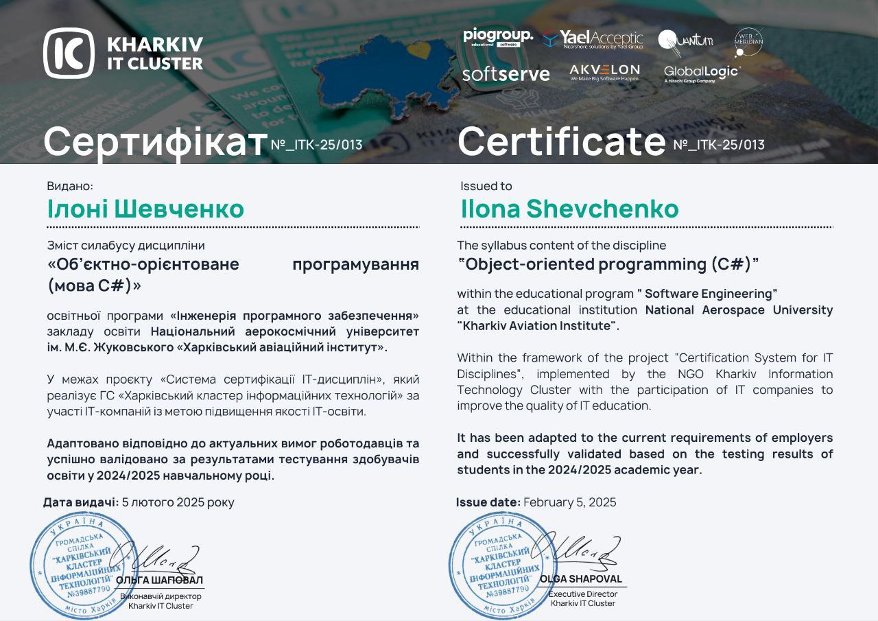 ✅ Доцент Шевченко Ілона Володимирівна – дисципліна «Об’єктно-орієнтоване програмування (C#)»