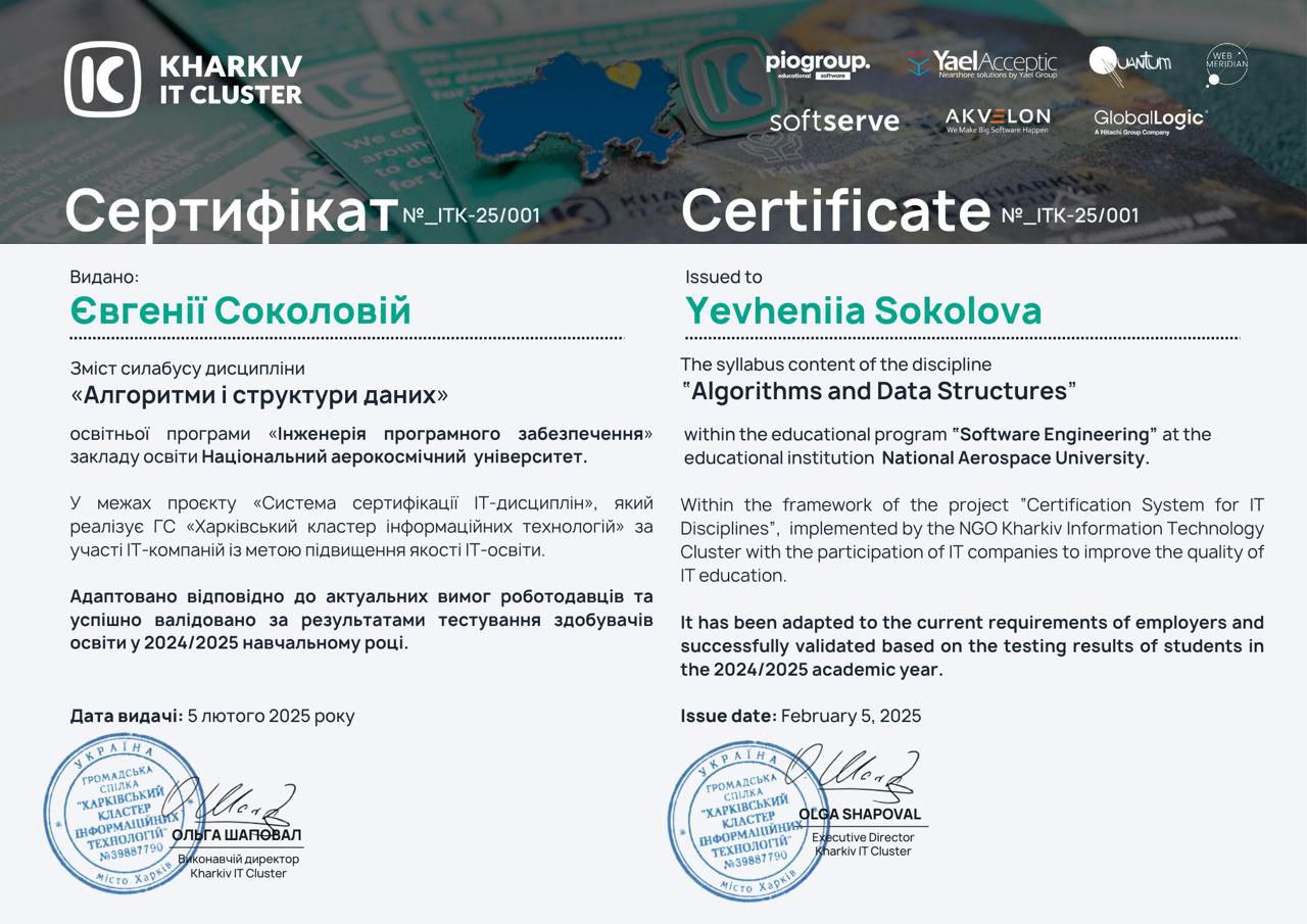 ✅ Доцент Соколова Євгенія Віталіївна – дисципліна «Алгоритми та структури даних»